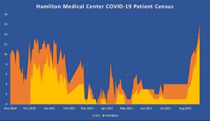 AT RIGHT: A graphic showing the census at Hamilton Medical Center with COVID patients (does not include Labor Day weekend information)