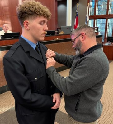 Caption: Logan Fowler has his Dalton Fire Department badge pinned to his uniform by his father, Jared Fowler