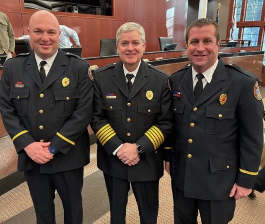 Caption: Captain Donnie Blankenship (left) and Captain Justin Rishel (right) pose with Chief Matt Daniel during Tuesday's meeting of the Public Safety Commission