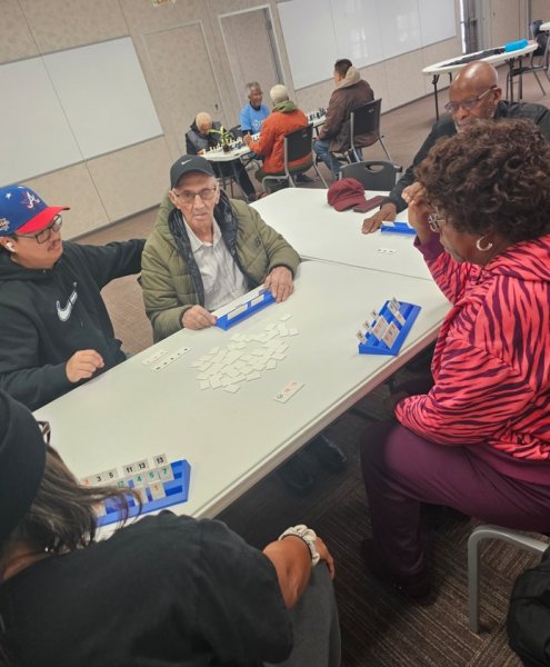 Caption: Dalton seniors play games together at a recent session of the DPRD's "Mind and Mingle" program. Retired school principal Paulette Bonds learned a new game with an 82-year old grandfather who came with his daughter and grandson to spend an afternoon out of the house