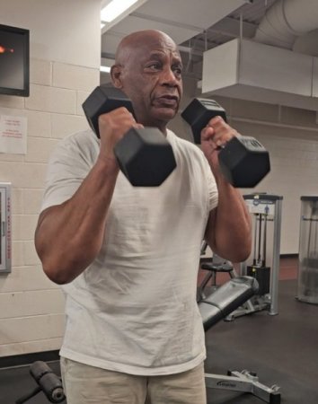 Caption: The "Senior Fit Club" program includes weight lifting exercises as well as stretching, mobility, and cardio fitness routines. Forrest Starks got some work in with dumbbells at the Mack Gaston Center gym