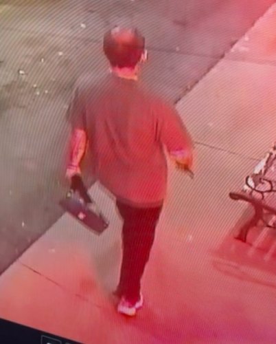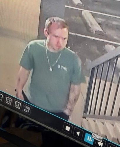 The suspect is a white male who wore dark pants, a green t-shirt, and a gold chain. He had close cropped balding hair.